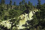 in ein Tal voller Bimssteinsäulen und -Pyramiden